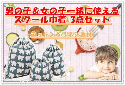 )(ルノン)Lunon 入学準備セット 3点セット (シロクマ柄)ナチュラル 素材 綿 麻 体操服入れ 巾着袋 体操服袋 巾着 袋 動物 給食袋 コップ袋 入園セット 入学【入園、入学準備の必需品!触り心地の良い綿麻生地♪